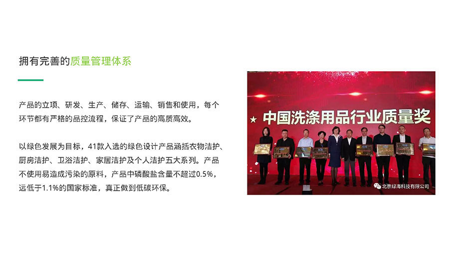 2018年11月,以綠色發(fā)展為目標(biāo)的41款綠傘產(chǎn)品入選綠色設(shè)計產(chǎn)品。這些產(chǎn)品均不使用易造成污染的原料,磷酸鹽含量不超過0.5%,遠低于1.1%的國家標(biāo)準,真正做到低碳環(huán)保。同年,綠傘榮獲中國洗滌用品工業(yè)協(xié)會頒發(fā)的“中國洗滌用品行業(yè)質(zhì)量獎”,這一獎項的頒發(fā)充分肯定了綠傘一直以來嚴把質(zhì)量關(guān)、綠色環(huán)保的發(fā)展戰(zhàn)略。