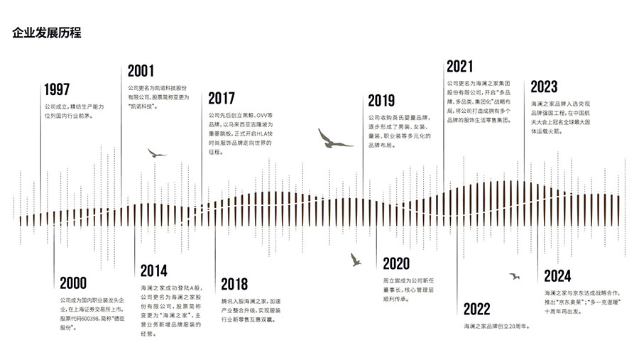 海瀾之家集團(tuán)股份有限公司的前身為凱諾科技股份有限公司,成立于1997年,2000年在上海證券交易所掛牌上市,股票代碼600398。海瀾之家總部位于江蘇省江陰市新橋鎮(zhèn),是國(guó)內(nèi)服裝行業(yè)龍頭企業(yè)、全國(guó)文明單位。以“海瀾”為企業(yè)命名,寓意為“以海闊天空之博大,創(chuàng)波瀾壯美之事業(yè)”。“不斷否定自己,永遠(yuǎn)追求卓越”是海瀾的企業(yè)精神,創(chuàng)新是海瀾的企業(yè)靈魂。