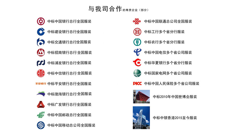 團(tuán)購(gòu)服務(wù)網(wǎng)絡(luò)已覆蓋全國(guó)各省、市、縣(區(qū))及鄉(xiāng)鎮(zhèn)各級(jí)地域,分公司遍及全國(guó),有5000余家門店,10000余名服務(wù)人員,300余名量體師為制裝客戶提供全面的售后服務(wù)。持續(xù)為國(guó)內(nèi)四大國(guó)有商業(yè)銀行及交通銀行、浦發(fā)銀行、招商銀行、中信銀行、廣發(fā)銀行等一系列大型企業(yè)設(shè)計(jì)行業(yè)制服??蛻羧荷婕敖鹑?、保險(xiǎn)、電力、法院、檢察院、稅務(wù)、工商、水政、技術(shù)監(jiān)督、電信、移動(dòng)、聯(lián)通、郵政、公路、航空機(jī)場(chǎng)、地鐵、保險(xiǎn)、券商、上市公司、環(huán)保、煙草、學(xué)校、醫(yī)院等20萬(wàn)余家政府、企事業(yè)單位。更為國(guó)慶、世博會(huì)、奧運(yùn)會(huì)、達(dá)沃斯論壇一系列大型盛會(huì)制作正裝。