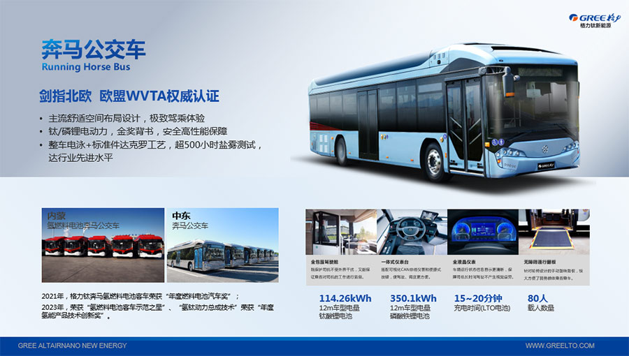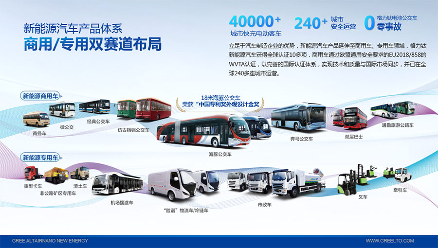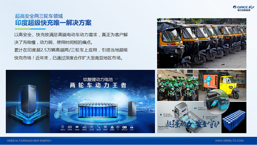 以完善的研發(fā)體系,格力鈦加快技術(shù)創(chuàng)新與產(chǎn)業(yè)升級的步伐。格力鈦研發(fā)的格力鈦電池安全性長期領(lǐng)跑行業(yè),憑借具有高安全、大倍率、快充放、耐寬溫、長壽命等特性,被選為“國家制造業(yè)單項冠軍產(chǎn)品”,廣泛應(yīng)用于新能源汽車以及工商業(yè)園區(qū)、通訊基站、電網(wǎng)調(diào)頻、軌道交通、風光消納、船舶岸電、家庭住宅、軍事科研等儲能領(lǐng)域,具有廣闊的市場前景和應(yīng)用價值。目前,格力鈦儲能產(chǎn)品已在丹麥、瑞士、芬蘭等全球30多個國家和地區(qū)使用,新能源汽車產(chǎn)品在北京、杭州、武漢、成都、青島、哈爾濱、包頭、海口等全球240多座城市運營,12年全球零電池事故安全運行。