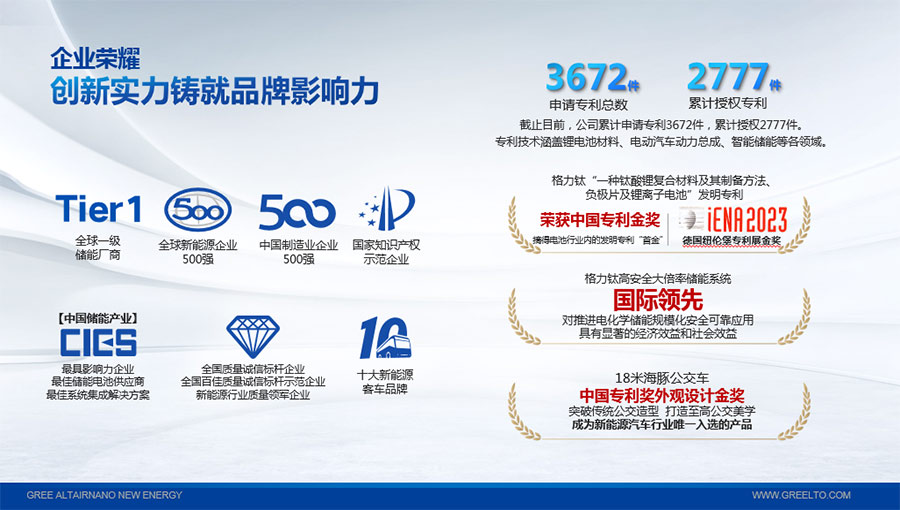 2022年,“一種鈦酸鋰復(fù)合材料及其制備方法、負極片及鋰離子電池”發(fā)明專利獲得中國專利金獎,摘得鋰電池行業(yè)內(nèi)的發(fā)明專利“首金”;2023年,該專利技術(shù)再次斬獲第75屆德國紐倫堡發(fā)明國際金獎。“高安全大倍率儲能系統(tǒng)關(guān)鍵技術(shù)研發(fā)與應(yīng)用”項目被中國機械工業(yè)聯(lián)合會鑒定達到“國際領(lǐng)先”水平。截至目前,格力鈦先后獲得“中國民營企業(yè)制造業(yè)500強”、“全國質(zhì)量信得過產(chǎn)品”、“客車安全技術(shù)成果獎”、“中國儲能產(chǎn)業(yè)最具影響力企業(yè)獎、最佳系統(tǒng)集成商、最佳儲能電池供應(yīng)商”等榮譽,獲得工信部頒發(fā)的“綠色工廠”榮譽稱號;上榜科技部發(fā)布的新能源領(lǐng)域獨角獸企業(yè),多年入選全球新能源企業(yè)500強,入選“全國百佳質(zhì)量檢驗誠信標桿企業(yè)”、“國家知識產(chǎn)權(quán)優(yōu)勢企業(yè)”等。