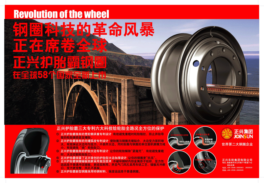 正興集團(tuán)在福建漳州(總部)、遼寧本溪、四川成都、河北廊坊、安徽合肥等地建有5家專業(yè)從事車輪制造的生產(chǎn)基地,產(chǎn)品以鋼制車輪為主,兼顧車橋、汽車螺栓等其它汽車零部件,市場營銷網(wǎng)絡(luò)覆蓋全國各省、市、自治區(qū),擁有銷售網(wǎng)點(diǎn)4000余個(gè),并遠(yuǎn)銷韓國、日本、印度、美國、歐洲、非洲、中美洲等70多個(gè)國家和地區(qū),為國內(nèi)外100多家大、中型汽車廠配套。