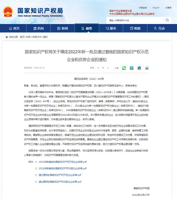 “國家知識(shí)產(chǎn)權(quán)優(yōu)勢(shì)企業(yè)”是我國知識(shí)產(chǎn)權(quán)管理領(lǐng)域的最高榮譽(yù)之一,是國家對(duì)企業(yè)在知識(shí)產(chǎn)權(quán)的創(chuàng)造、運(yùn)用、保護(hù)、管理等方面的突出工作所作出的高度評(píng)價(jià)。入選企業(yè)都是擁有自主知識(shí)產(chǎn)權(quán)和知名品牌、具備行業(yè)競(jìng)爭優(yōu)勢(shì)的技術(shù)領(lǐng)先企業(yè)。
