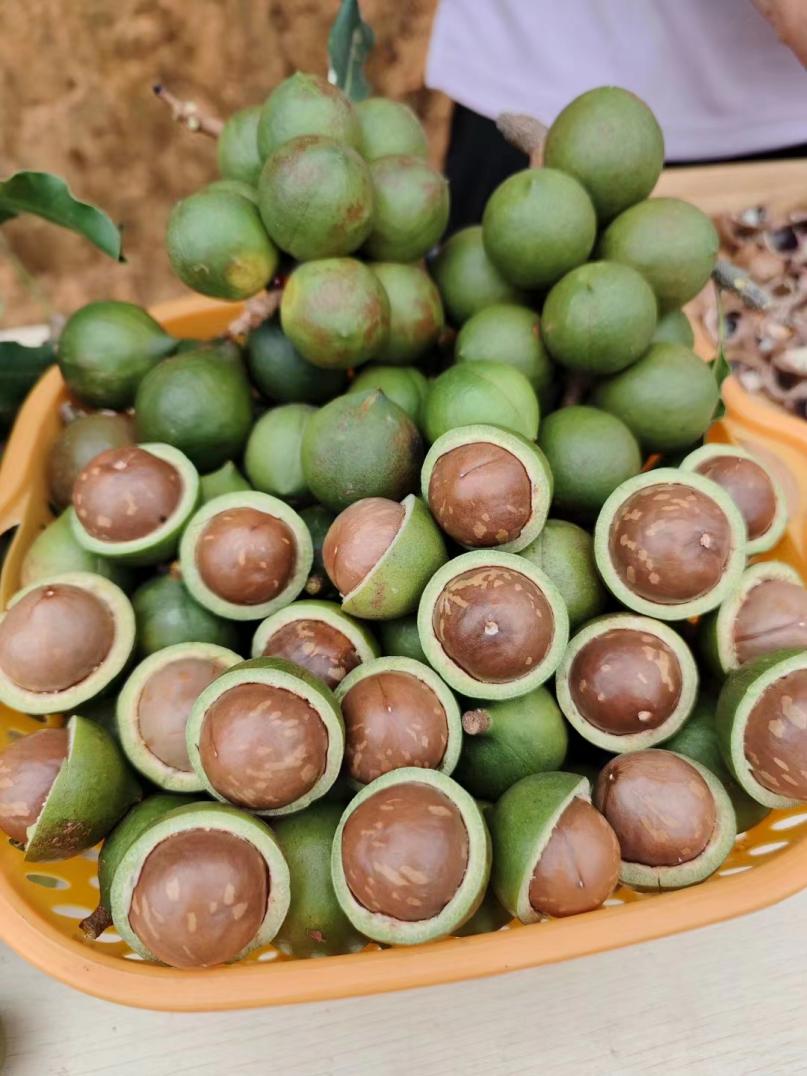 樹上,一串串咖啡色的堅(jiān)果掛滿枝,陣陣飄香;樹下,果農(nóng)來回穿梭采摘忙。