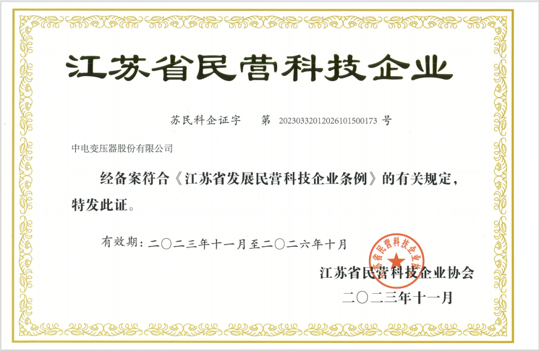 中電變壓器榮獲“江蘇省民營(yíng)科技企業(yè)”稱號(hào)