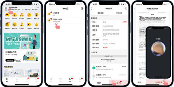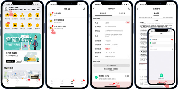 客戶線上確定好裝修門(mén)店后,門(mén)店會(huì)擬好線上合同,并推送到客戶的APP賬號(hào),客戶收到合同簽約提醒就可以在線簽約操作了,合同簽好后通過(guò)進(jìn)度款支付提醒可以進(jìn)行在線付款操作。