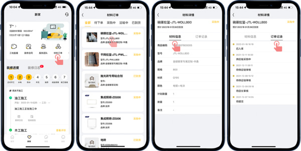 此外,也能在“新家-材料訂單”查看裝修涉及到的材料采購(gòu)和到貨情況,省去客戶去現(xiàn)場(chǎng)查看的麻煩,如果材料未按約定時(shí)間到貨,客戶也能及時(shí)跟催門(mén)店處理,以免耽誤裝修進(jìn)度。
