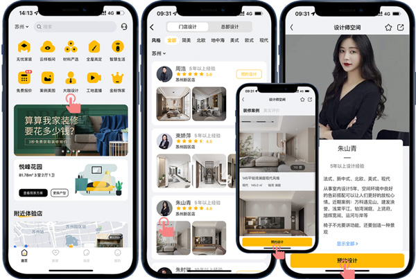 打開(kāi)金螳螂家APP,進(jìn)入首頁(yè)“大咖設(shè)計(jì)”,可了解設(shè)計(jì)師的個(gè)人簡(jiǎn)介,以及他的優(yōu)秀裝修作品和客戶的真實(shí)評(píng)價(jià),通過(guò)以上了解,客戶挑選中意的設(shè)計(jì)師,馬上預(yù)約,就可與他線上直接暢聊溝通設(shè)計(jì)方案、設(shè)計(jì)細(xì)節(jié),為客戶量身定制專屬方案。
