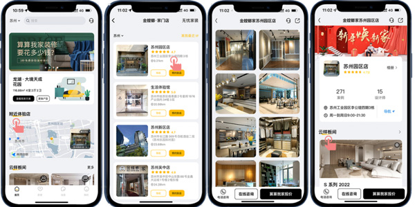 目前,金螳螂家在全國(guó)擁有150家門(mén)店,客戶可以通過(guò)“附近體驗(yàn)店”選擇客戶所在城市的服務(wù)門(mén)店,在這里可以了解到該門(mén)店的720度VR全景樣板間、案例、設(shè)計(jì)師以及客戶的真實(shí)評(píng)價(jià),不用出門(mén)探訪實(shí)體門(mén)店,就能快速了解門(mén)店情況,省時(shí)又省力!