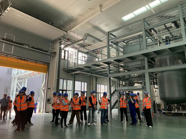 在李艷國董事長、生產部經理王建成等領導的陪同下,商學院觀摩團先后參觀了新廠的基礎油儲罐區(qū)、實驗中心、潤滑油調和設備及灌裝生產線、潤滑脂調和設備、金屬加工油液/防凍液/尿素溶液的生產工藝及設備。