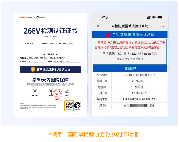 首先,268V官方提供的檢測報告,是支持“防偽溯源查詢”,每份報告均可驗證真?zhèn)?。消費者在買車時,如果檢測報告是268V的,直接掃描防偽查詢二維碼,對報告進(jìn)行驗證,假報告第一時間不攻自破;
