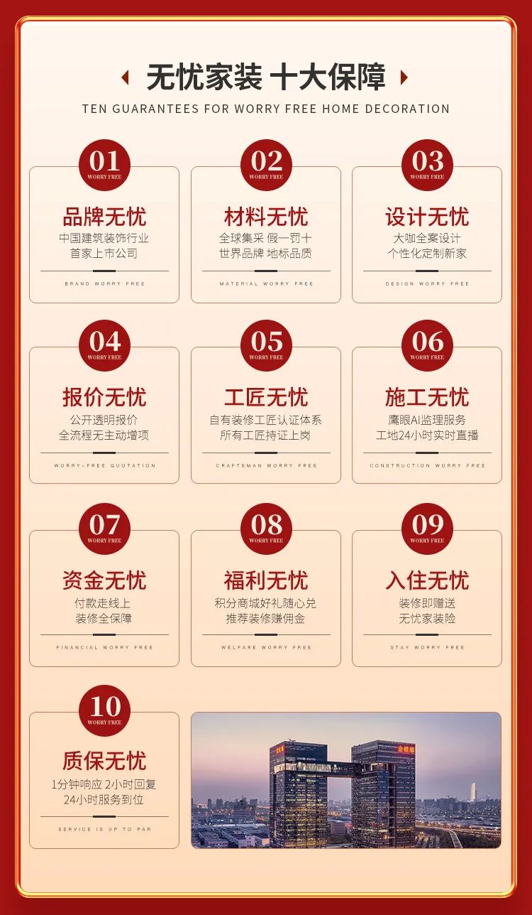 一直以來,金螳螂家高度重視產(chǎn)品質(zhì)量,努力提高服務(wù)水平,面向消費(fèi)者推出無憂家裝十大保障及全線上化家裝服務(wù)體驗(yàn),基礎(chǔ)工程十年質(zhì)保。我們始終抱著以客戶為中心的初衷,及時(shí)為客戶提供全方位優(yōu)質(zhì)服務(wù)。為保障用戶合法權(quán)益,不斷提高服務(wù)質(zhì)量,金螳螂家建立起一套用戶服務(wù)監(jiān)督機(jī)制并設(shè)立客服中心,受理用戶投訴和舉報(bào),以服務(wù)熱線4000306888架起服務(wù)的橋梁, 為每一個(gè)客戶提供售后無憂保障。