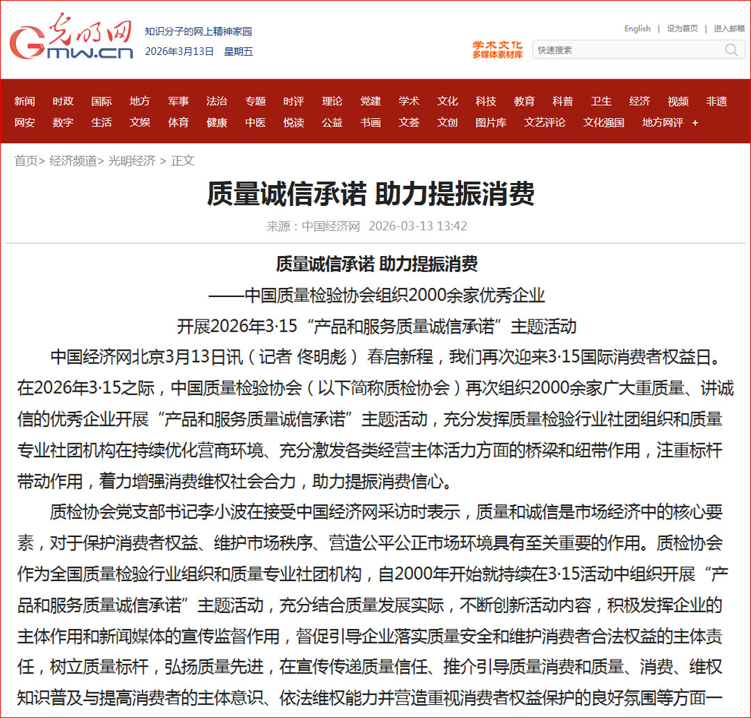 光明網(wǎng)報(bào)道:質(zhì)量誠(chéng)信承諾 助力提振消費(fèi)——中國(guó)質(zhì)量檢驗(yàn)協(xié)會(huì)組織2000余家優(yōu)秀企業(yè)開展2026年3·15“產(chǎn)品和服務(wù)質(zhì)量誠(chéng)信承諾”主題活動(dòng)