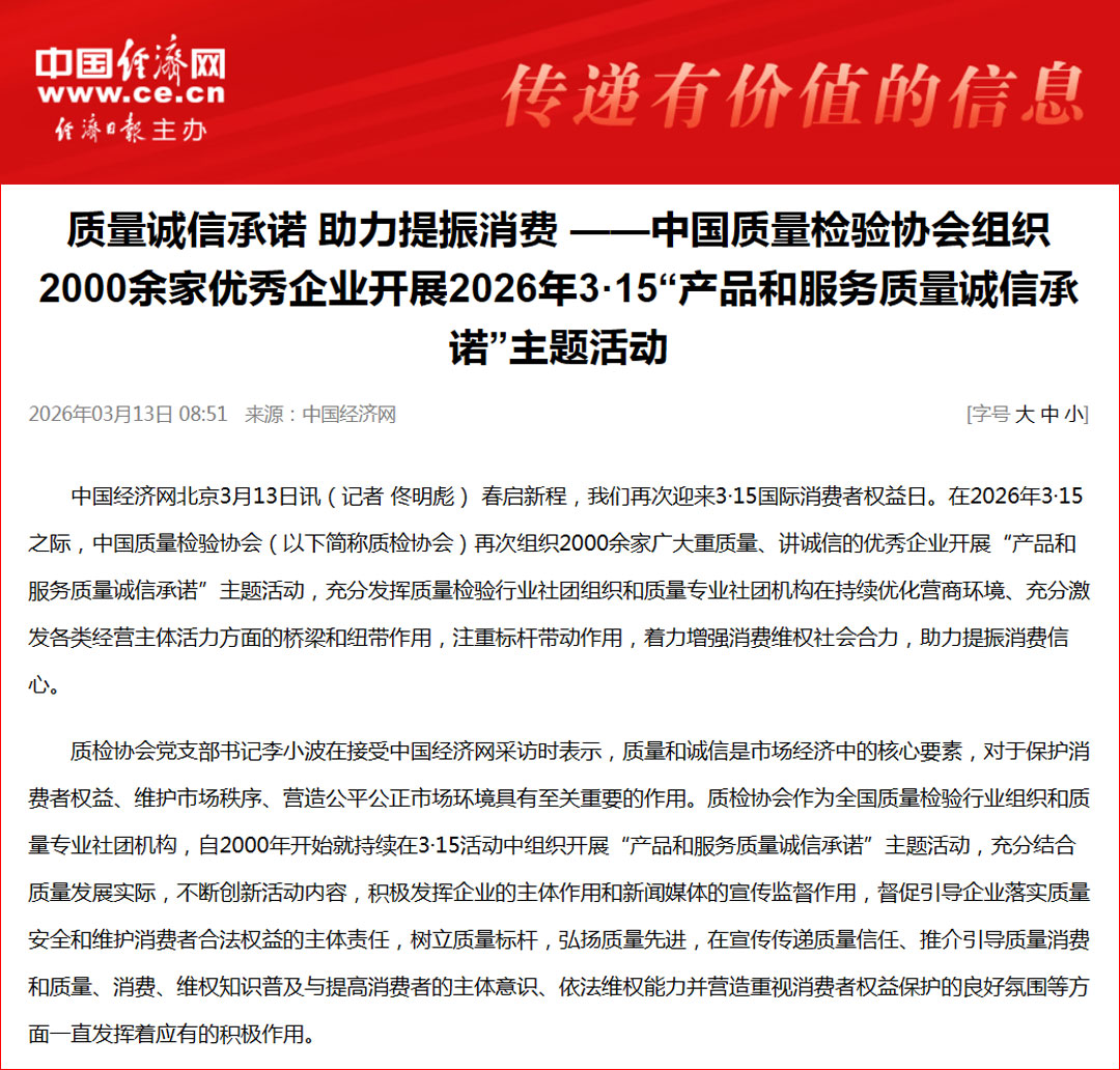 中國(guó)經(jīng)濟(jì)網(wǎng)發(fā)布:質(zhì)量誠(chéng)信承諾 助力提振消費(fèi)——中國(guó)質(zhì)量檢驗(yàn)協(xié)會(huì)組織2000余家優(yōu)秀企業(yè)開展2026年3·15“產(chǎn)品和服務(wù)質(zhì)量誠(chéng)信承諾”主題活動(dòng)