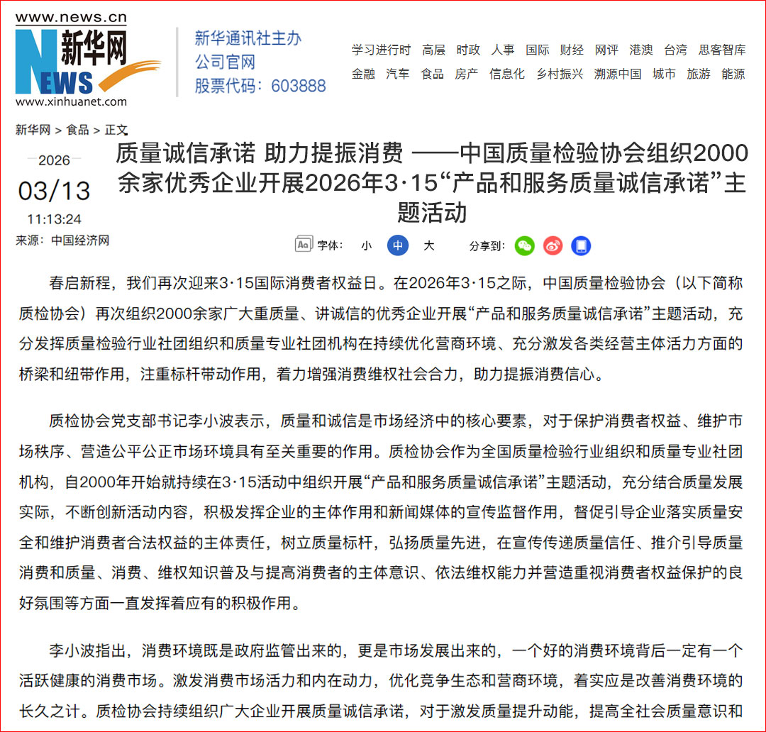 新華網(wǎng)客戶端報(bào)道:質(zhì)量誠(chéng)信承諾 助力提振消費(fèi)——中國(guó)質(zhì)量檢驗(yàn)協(xié)會(huì)組織2000余家優(yōu)秀企業(yè)開展2026年3·15“產(chǎn)品和服務(wù)質(zhì)量誠(chéng)信承諾”主題活動(dòng)