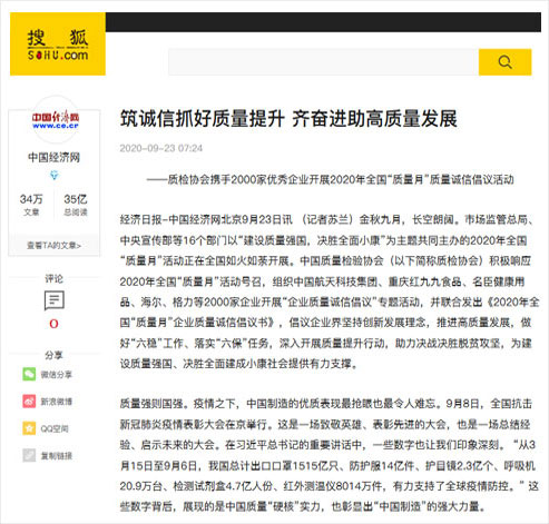 搜狐網(wǎng):筑誠信抓好質(zhì)量提升 齊奮進(jìn)助高質(zhì)量發(fā)展——質(zhì)檢協(xié)會攜手2000家優(yōu)秀企業(yè)開展2020年全國“質(zhì)量月”質(zhì)量誠信倡議活動