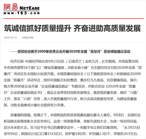 網(wǎng)易:筑誠信抓好質(zhì)量提升 齊奮進(jìn)助高質(zhì)量發(fā)展——質(zhì)檢協(xié)會攜手2000家優(yōu)秀企業(yè)開展2020年全國“質(zhì)量月”質(zhì)量誠信倡議活動