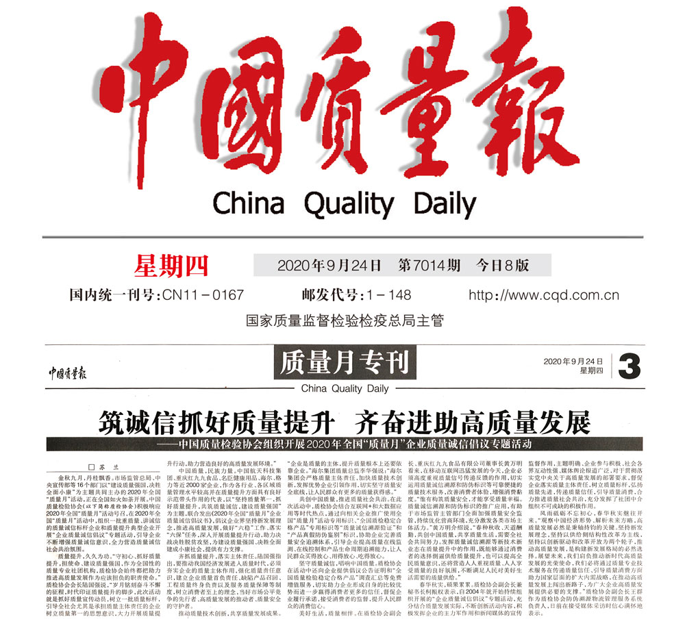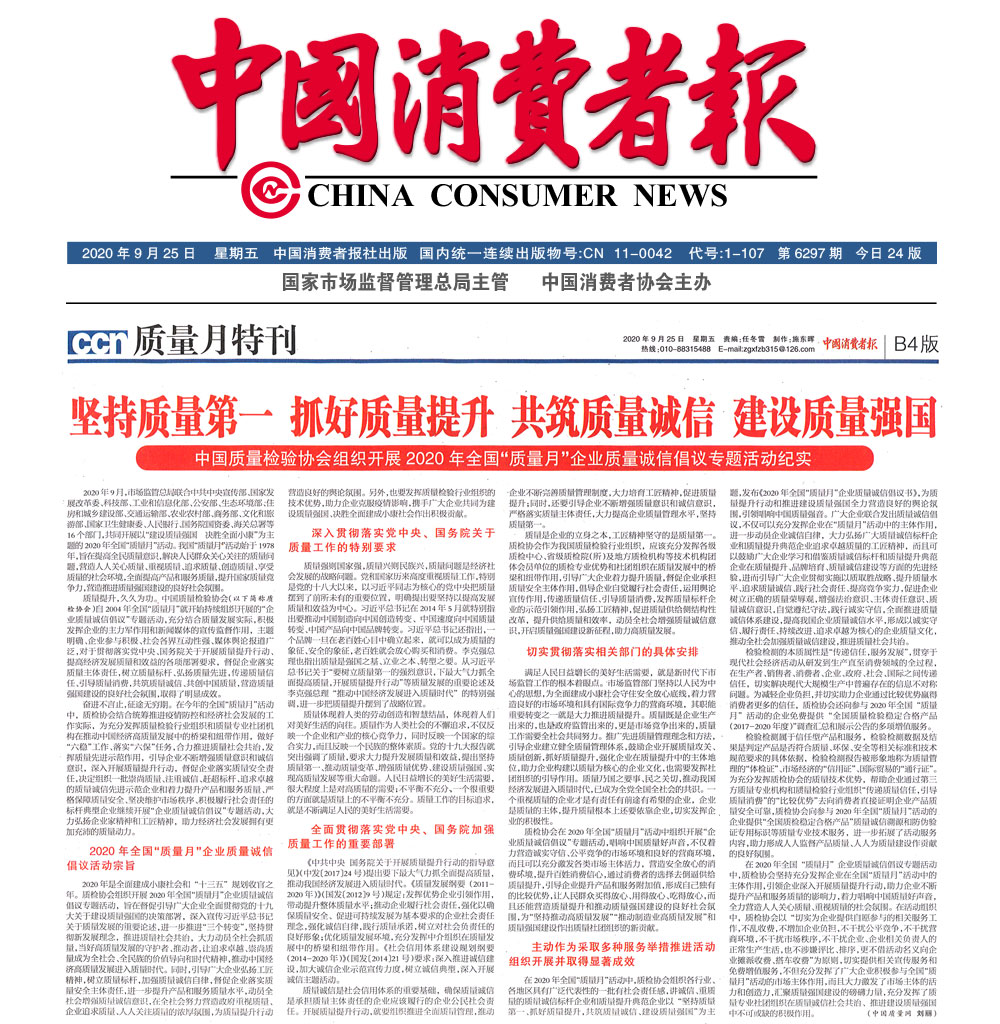 中國消費(fèi)者報(bào):堅(jiān)持質(zhì)量第一 抓好質(zhì)量提升 共筑質(zhì)量誠信 建設(shè)質(zhì)量強(qiáng)國——中國質(zhì)量檢驗(yàn)協(xié)會組織開展2020年全國“質(zhì)量月”企業(yè)質(zhì)量誠信倡議專題活動紀(jì)實(shí)