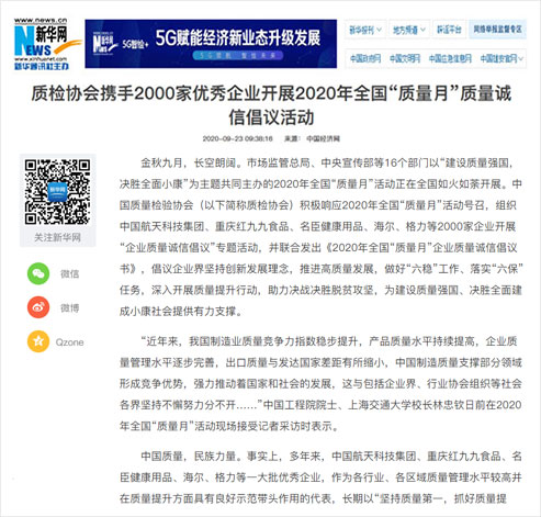 新華網(wǎng):質(zhì)檢協(xié)會攜手2000家優(yōu)秀企業(yè)開展2020年全國“質(zhì)量月”質(zhì)量誠信倡議活動
