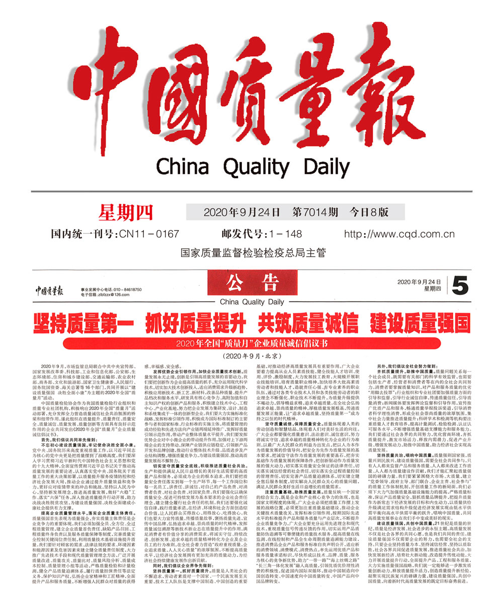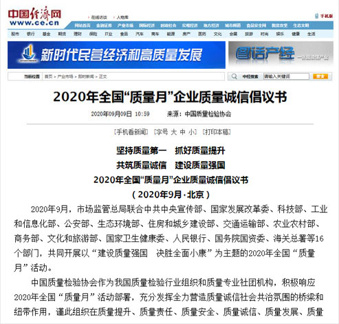 中國經(jīng)濟(jì)網(wǎng):堅(jiān)持質(zhì)量第一 抓好質(zhì)量提升 共筑質(zhì)量誠信 建設(shè)質(zhì)量強(qiáng)國——2020年全國“質(zhì)量月”企業(yè)質(zhì)量誠信倡議書