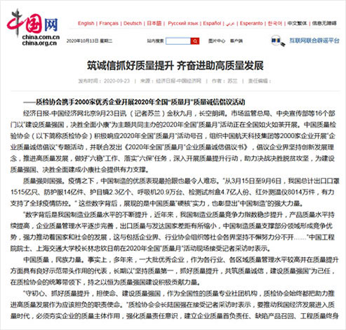 中國經(jīng)濟(jì)網(wǎng):建設(shè)質(zhì)量強(qiáng)國 決勝全面小康——中國質(zhì)量檢驗(yàn)協(xié)會組織開展2020年全國“質(zhì)量月”企業(yè)質(zhì)量誠信倡議專題活動紀(jì)實(shí)