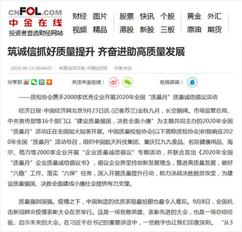 中金在線:筑誠信抓好質(zhì)量提升 齊奮進(jìn)助高質(zhì)量發(fā)展——質(zhì)檢協(xié)會攜手2000家優(yōu)秀企業(yè)開展2020年全國“質(zhì)量月”質(zhì)量誠信倡議活動