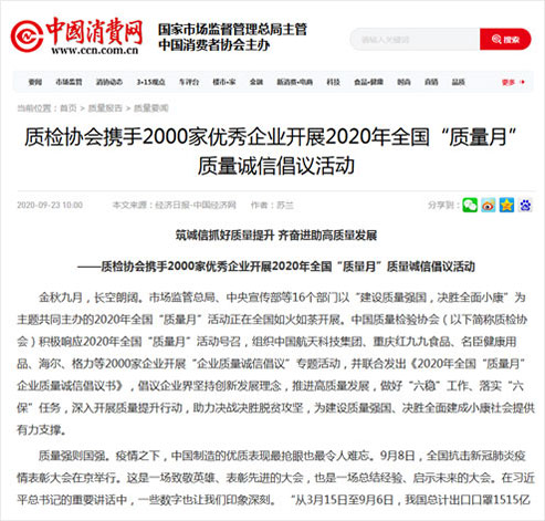 中國經(jīng)濟(jì)網(wǎng):筑誠信抓好質(zhì)量提升 齊奮進(jìn)助高質(zhì)量發(fā)展——質(zhì)檢協(xié)會攜手2000家優(yōu)秀企業(yè)開展2020年全國“質(zhì)量月”質(zhì)量誠信倡議活動
