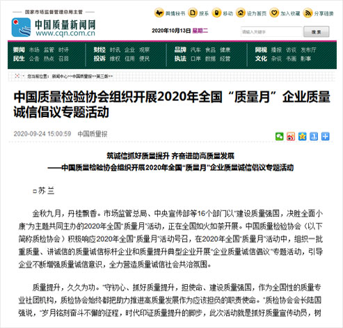 中國質(zhì)量新聞網(wǎng):筑誠信抓好質(zhì)量提升 齊奮進(jìn)助高質(zhì)量發(fā)展——中國質(zhì)量檢驗(yàn)協(xié)會組織開展2020年全國“質(zhì)量月”企業(yè)質(zhì)量誠信倡議專題活動