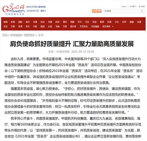光明網(wǎng):肩負使命抓好質(zhì)量提升 匯聚力量助高質(zhì)量發(fā)展——中國質(zhì)量檢驗協(xié)會組織開展2021年全國“質(zhì)量月”企業(yè)質(zhì)量誠信倡議專題活動