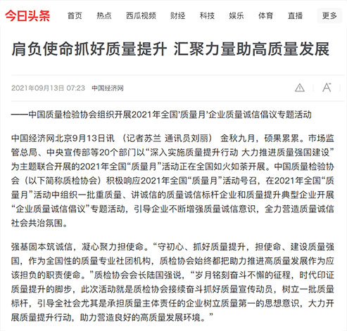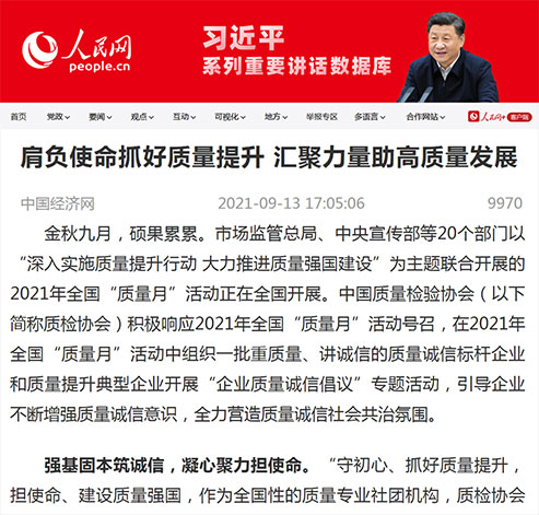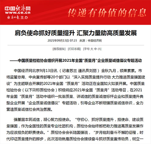 中國經(jīng)濟網(wǎng):肩負使命抓好質(zhì)量提升 匯聚力量助高質(zhì)量發(fā)展——中國質(zhì)量檢驗協(xié)會組織開展2021年全國“質(zhì)量月”企業(yè)質(zhì)量誠信倡議專題活動