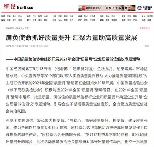 搜狐網(wǎng):肩負使命抓好質(zhì)量提升 匯聚力量助高質(zhì)量發(fā)展——中國質(zhì)量檢驗協(xié)會組織開展2021年全國“質(zhì)量月”企業(yè)質(zhì)量誠信倡議專題活動